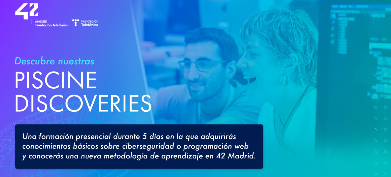 La Piscine Discovery de 42 Madrid te permitirá acercarte al mundo del código durante 5 días de forma intensiva. Una experiencia disruptiva y presencial para aprender ciberseguridad o programación web con la que podrás experimentar la metodología de nuestro campus, sin profesores y basada en el intercambio de conocimiento con tus compañeros y compañeras.